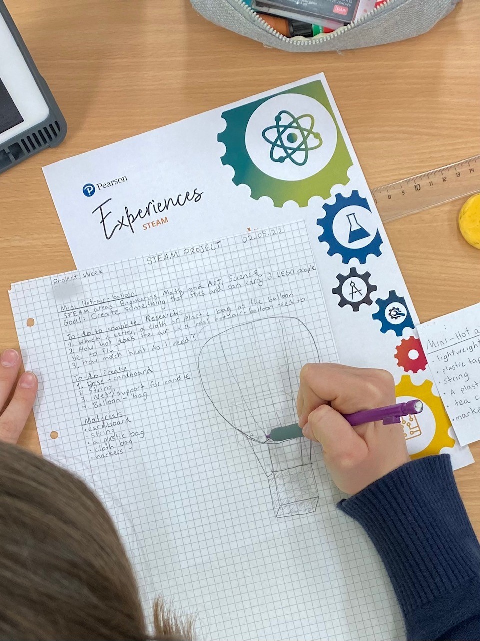 - Year 7 and 8 started their STEAM project this morning. Here a student is outlining their passenger carrying hot air balloon idea.